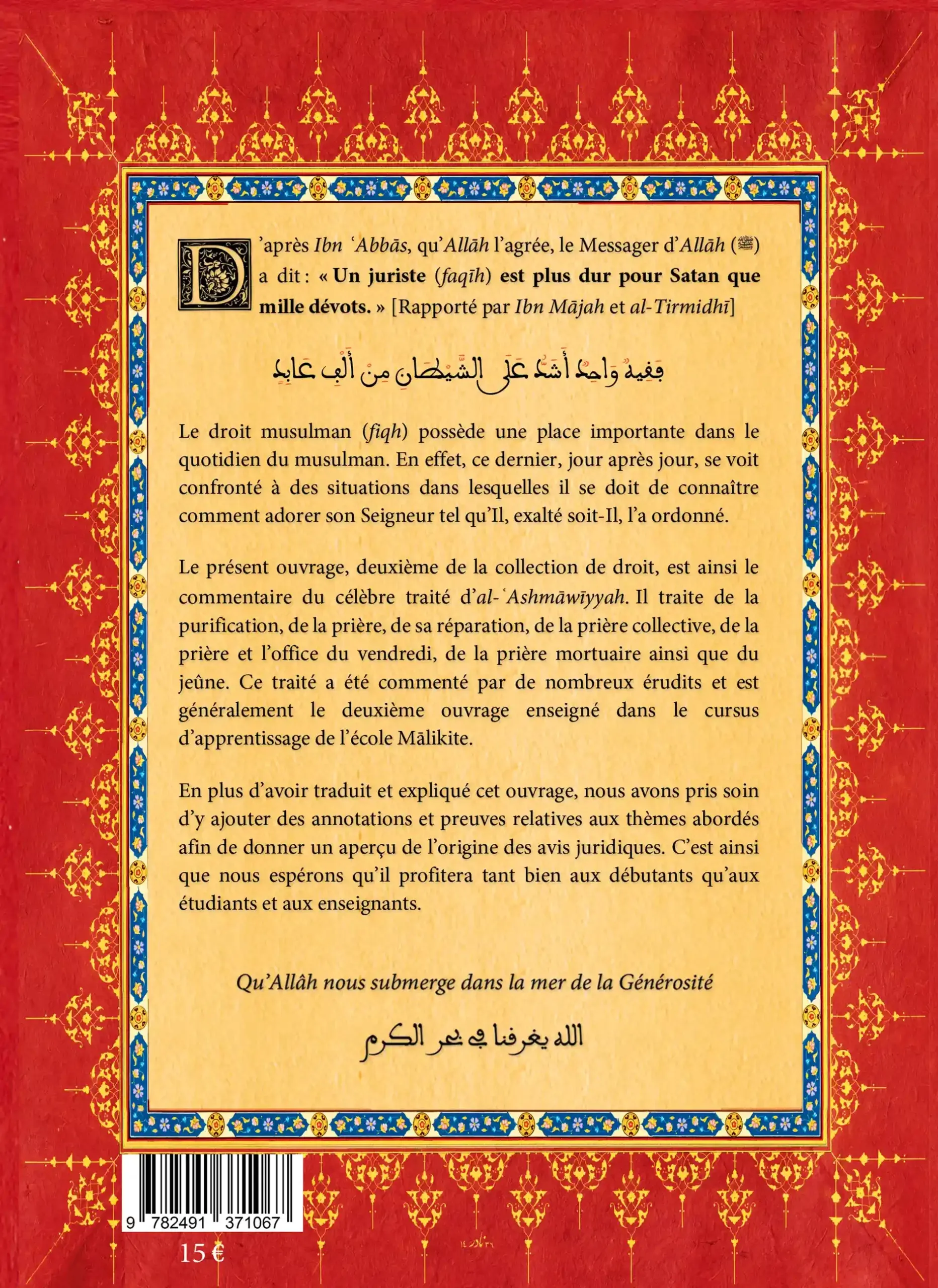 Ce livre est un commentaire du célèbre condensé de l’Imam al-ʿAshmāwiyyah. Il traite du droit islamique : la purification, de la prière, sa réparation, de la prière collective, de la prière et l’office du vendredi, de la prière mortuaire ainsi que du jeûne. Il figure parmi les premiers dans l’enseignement de l’école Malikite. Cette version commentée a spécialement été écrite pour être accessible aux débutants et/ou comme manuel d’apprentissage aux francophones. Des annotations mentionnant les preuves des avis ont également été ajoutées.